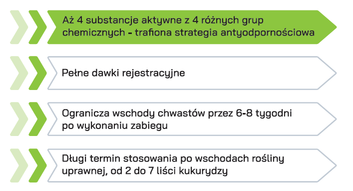 - Trzy produkty i aż 4 substancje aktywne z 4 grup chemicznych o różnym mechanizmie działania i wysokiej skuteczności chwastobójczej.